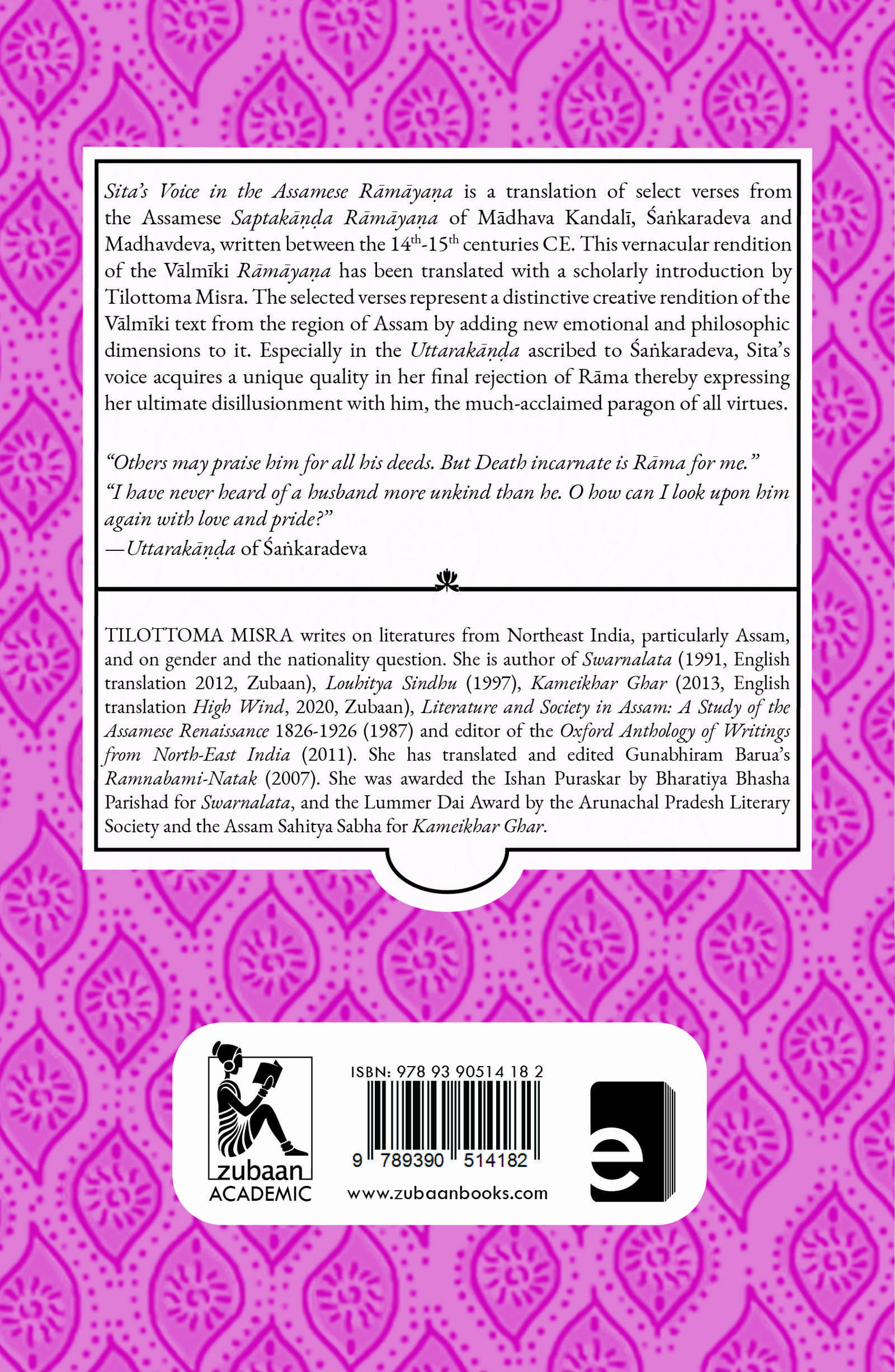 Sita’s Voice in the Assamese Rāmāyaṇa is a translation of select verses from the Assamese Saptakāṇḍa Rāmāyaṇa of Mādhava Kandalī, Śaṅkaradeva and Madhavdeva, written between the 14th-15th centuries CE. This vernacular rendition of the Vālmīki Rāmāyaṇa has been translated with a scholarly introduction by Tilottoma Misra. The selected verses represent a distinctive creative rendition of the Vālmīki text from the region of Assam by adding new emotional and philosophic dimensions to it. Especially in the Uttarakāṇḍa ascribed to Śaṅkaradeva, Sita’s voice acquires a unique quality in her final rejection of Rāma thereby expressing her ultimate disillusionment with him, the much-acclaimed paragon of all virtues. “Others may praise him for all his deeds. But Death incarnate is Rāma for me.” “I have never heard of a husband more unkind than he. O how can I look upon him again with love and pride?” —Uttarakāṇḍa of Śaṅkaradeva