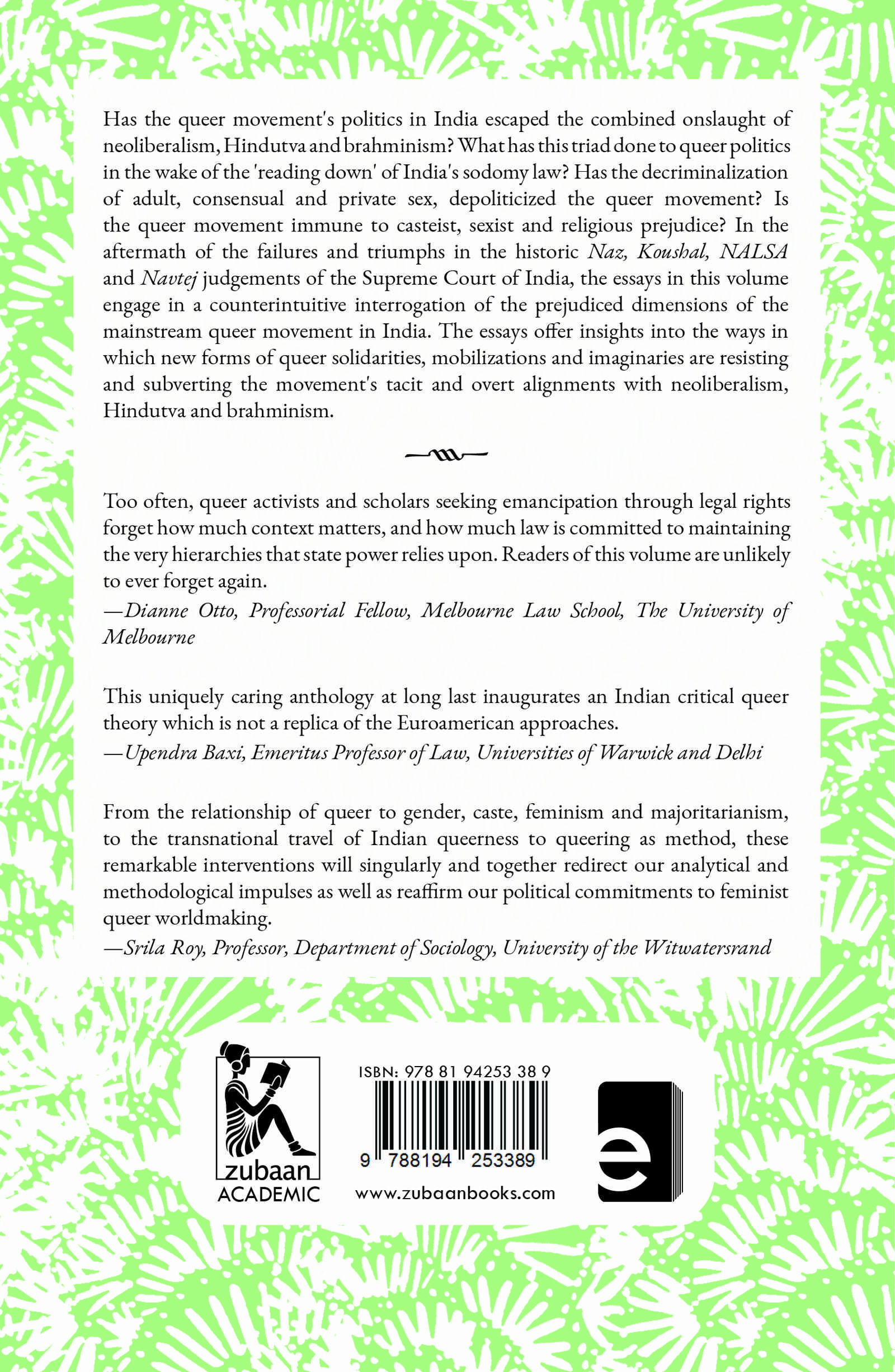 Has the queer movement's politics in India escaped the combined onslaught of neoliberalism, Hindutva and brahminism? What has this triad done to queer politics in the wake of the 'reading down' of India's sodomy law? Has the decriminalization of adult, consensual and private sex, depoliticized the queer movement? Is the queer movement immune to casteist, sexist and religious prejudice? In the aftermath of the failures and triumphs in the historic Naz, Koushal, NALSA and Navtej judgements of the Supreme Court of India, the essays in this volume engage in a counterintuitive interrogation of the prejudiced dimensions of the mainstream queer movement in India. The essays offer insights into the ways in which new forms of queer solidarities, mobilizations and imaginaries are resisting and subverting the movement's tacit and overt alignments with neoliberalism, Hindutva and brahminism.